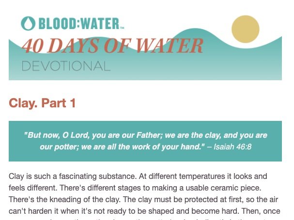 Join the challenge and sign up for the 40 Days of Water devotional emails! Each day, you will receive a new devotional entry, delivered straight to your inbox.